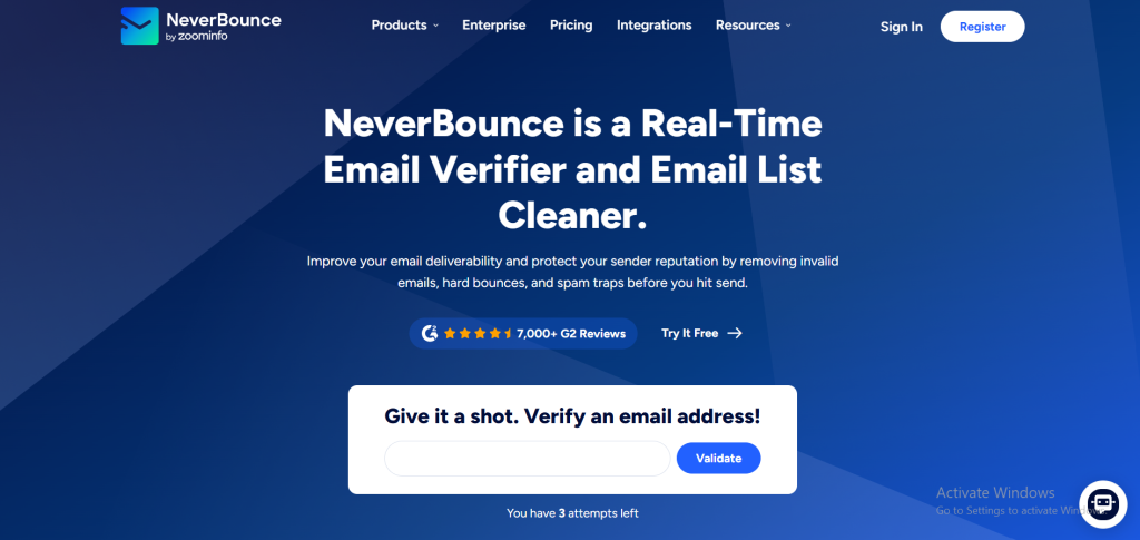NeverBounce is a popular tool at $0.008 per email and includes a one-time free signup credit of 1,000 verifications. Prepaid credits expire monthly. It integrates with major ESPs and CRMs, but it doesn’t offer a price advantage over MyEmailVerifier.